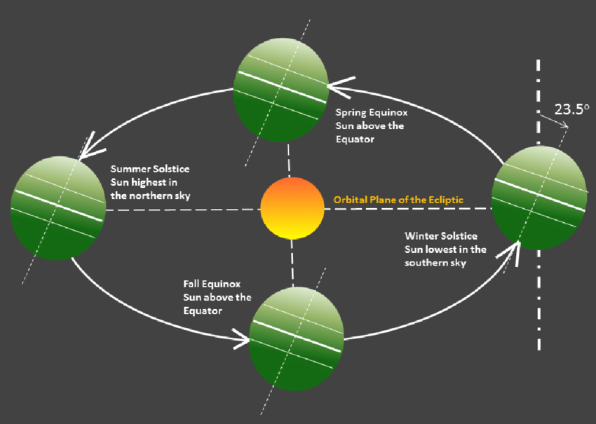 Earth does not orbit the Sun on a flat plane, meaning our equator being parallel to the plane of our orbit. Instead, the Earth’s axis is tilted at 23° 27′ to the perpendicular of our orbital plane. It is this tilt that causes our seasons to occur.
