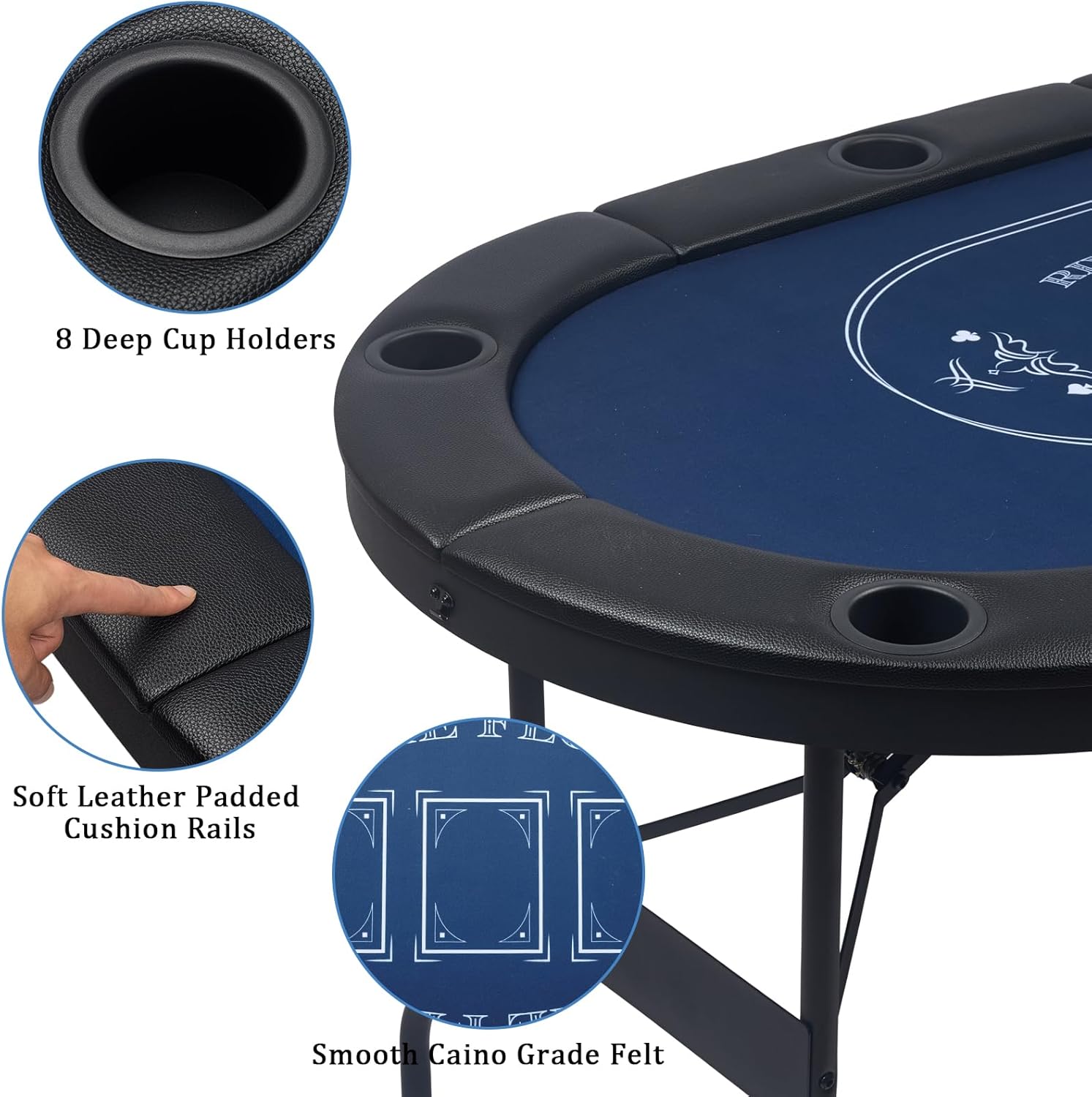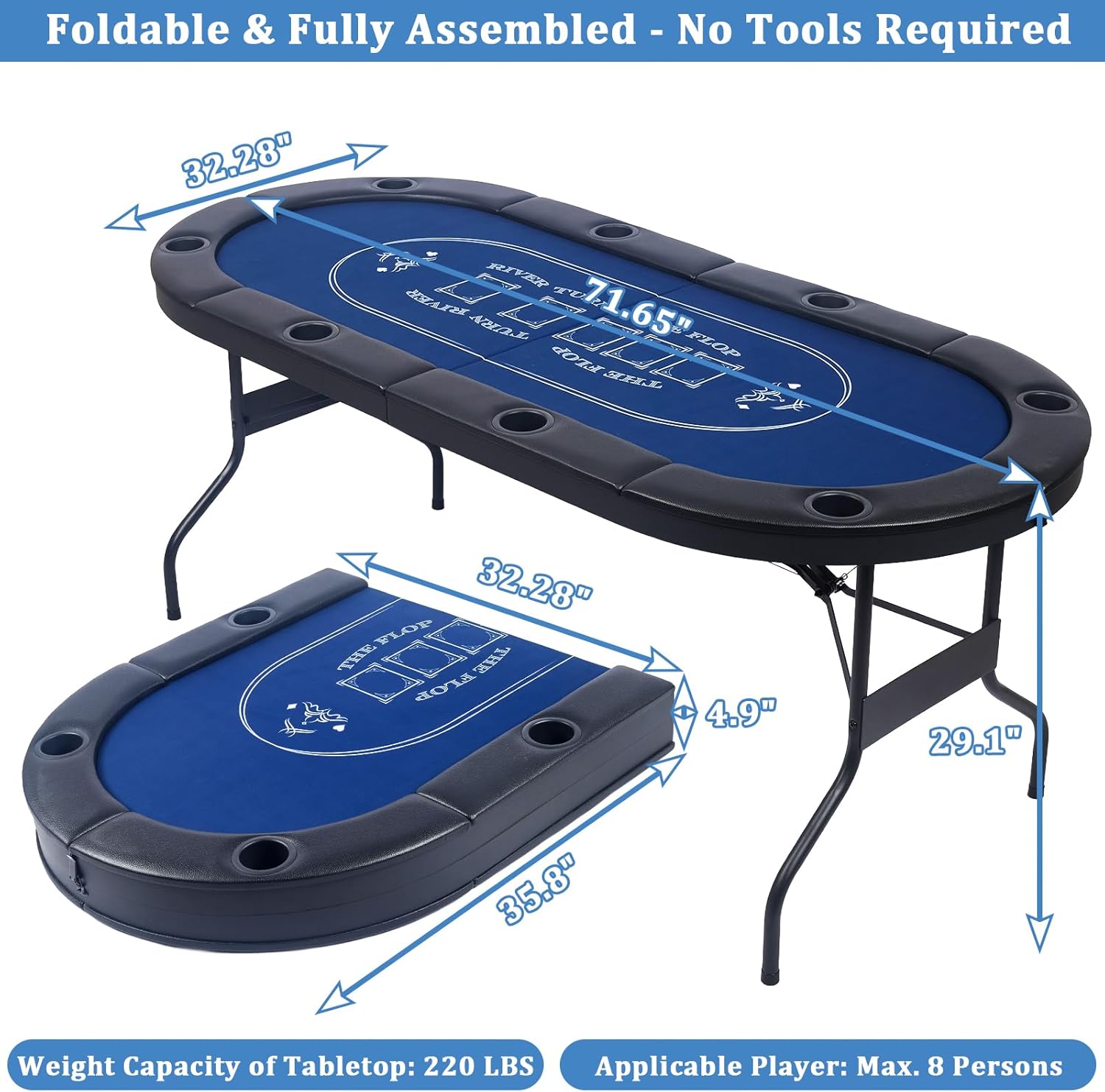 DescriptionTired of complicated setup or wobbly tables ruining your game nights? Our 72-inch oval folding poker table brings an authentic Vegas casino vibe home—no hassle, just nonstop fun for 8 players. Perfect for Texas Hold'em, blackjack and more, it’s your go-to for family nights, gatherings, picnics and camping. No assembly stress—it’s 100% pre-assembled for instant play. Unfold, lock in 3 seconds, and game with zero tools—no more wasting 30+ mins on setup. Fold into a compact, safety-locked size for easy storage, saving floor space. Lightweight yet sturdy, it’s easy to carry to any event. Beyond convenience, indulge in premium casino-grade details. The ultra-smooth, wrinkle-resistant felt muffles card-handling noise, creating an immersive vibe. Thick water-resistant PU leather armrests cradle arms during marathons—no soreness after hours of play. Designed for intense gaming sessions, it boasts a heavy-duty reinforced frame, sturdy legs, triangular support and steel cables that ensure zero wobble—even in high-stakes bets. Non-slip foot pads protect floors, keep it level, and guarantee durability for years. Adding to the practicality, thoughtful details boost convenience. Unlike flimsy shallow holders, our 8 deep stainless steel cups (2.76”W x 2.28”D) lock drinks securely, no spills. Easy-clean surfaces and sleek design upgrade your game room/man cave, blending function and style. Grab yours now to turn gatherings into unforgettable casino nights!Note: When not in use, it can be folded up and then covered with our provided dust cover. This will effectively extend the product's service life.SpecificationsColor: Black and Dark BlueMaterial: Steel, PU Leather, Felt, MDFProduct Size: 71.65" L x 32.28" W x 29.1" H ( 182cm x 82cm x 74cm)Folding Product Size: 35.8" x 32.28" x 4.9" Poker Table Weight: 55.12 lbs (25 kg)Delivery Contains: 1 x Poker Table, 1 x Dust Cover