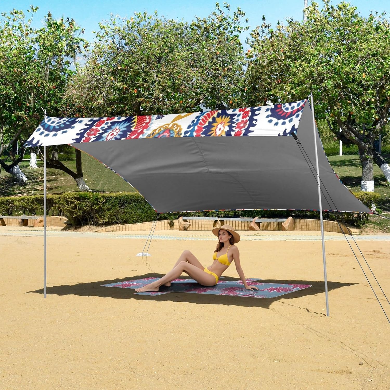 Unpack Cooling trip in 10 minutes! Our 280x320cm beach tent features silver-coated polyester oxford fabric that actively deflects heat while providing UPF 50+ protection-say goodbye to sunburns and squinting! Express your style with eye-catching, tropical-inspired prints that transform ordinary shade into a vibrant oasis. Engineered for stubborn coastal winds, the reinforced frame supports extra guy ropes alongside the included 4 refillable sandbags (use the free shovel!), 4 heavy-duty steel stakes, and 4 reinforced ropes. This high-grade anchoring system laughs at 25mph gusts while you relax. Adventure Beyond Sand: Beach lounging Lakeside camping Park picnics Fishing trips Festival hangouts Backyard "staycations