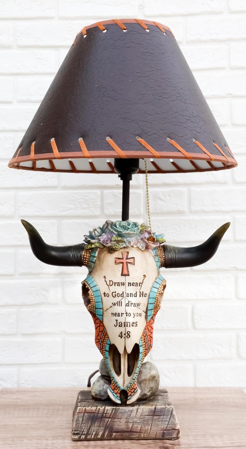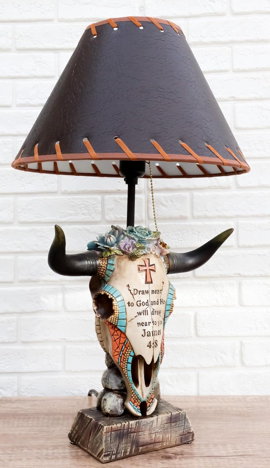 This western decoration is always a sensation for cowboys or lovers of the wild west. This decorative desktop or table lamp adds a well lit frontier touch to any room decorated with Western or Southwest themed home accents. Featuring a well detailed cow skull dressed with colorful floral succulents set on a faux wood base, the table lamp is sure to draw compliments from your guests! The lamp sculpture is also inscribed with bible scriptures of James 4:8. An orange colored cross is sculpted onto the temple of the skull above the verses.