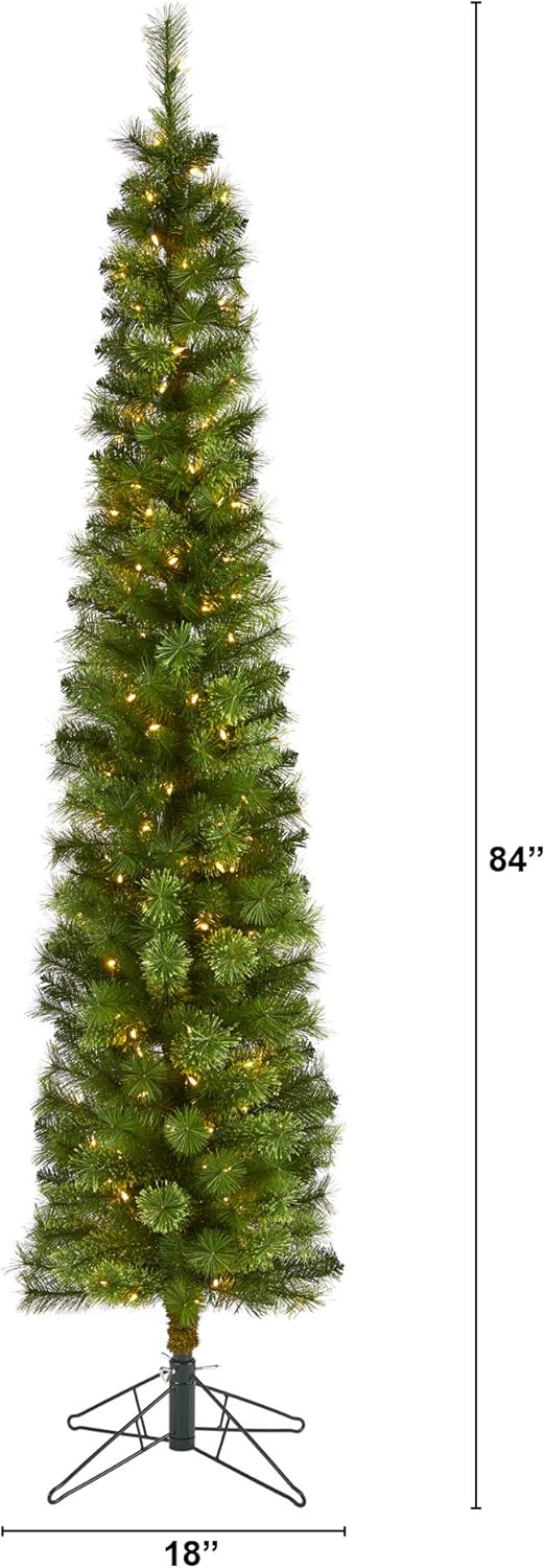 Create a traditional Christmas scene in a limited space environment with the help of this pencil slim artificial Christmas tree! Perfect for the smallest, tightest spaces because of its narrow, pencil-like design, it boasts spaced tiers of evergreen foliage made up of 338 easy-to-bend branch tips for showcasing all your favorite holiday ornaments. Pre-strung with 150 clear LED lights, it also features 8 different light options (including Twinkle, Bursts, and Fade) to create a true holiday glow wherever displayed. Carefully stabilized on a metal stand, this impressive, space-saving 7’ tall artificial Christmas tree will make decorating a breeze for years to come. About Nearly Natural Inc. - For over 75 years, Nearly Natural Inc. has been providing conscientious consumers with beautiful alternatives to natural decorations. Employing and advised by naturalists who understand the live plant world, Nearly Natural is able to recreate the most realistic-looking decorative items for homes, offices, and businesses. Driven by a true commitment to customer service, attention to detail, and natural philosophy, Nearly Natural strives to bring customers the most beautiful, unique, and striking faux plants and floral on the market. MATERIALS:PVC, Hardneedle, Iron Wire, Metal