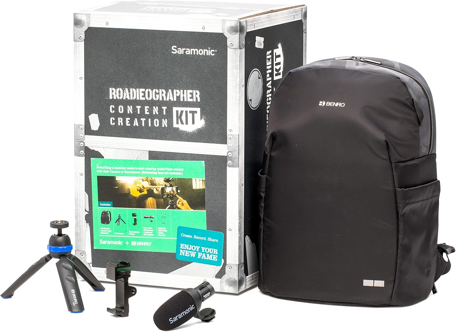 | BuiltIn Media | Kit Includes: Benro Tourist 200 Weatherproof Backpack (Black) Benro PP1 PocketPod Tabletop Tripod Saramonic SR-BSP1C Mobile Device Mount with Cold Shoe Mount Saramonic Vmic Mini Camera-Mountable Shotgun Microphone Fitted Foam Windscreen 3.5mm TRS to 3.5mm TRS Output Cable 3.5mm TRS to 3.5mm TRRS Output Cable Information card Warranty card |