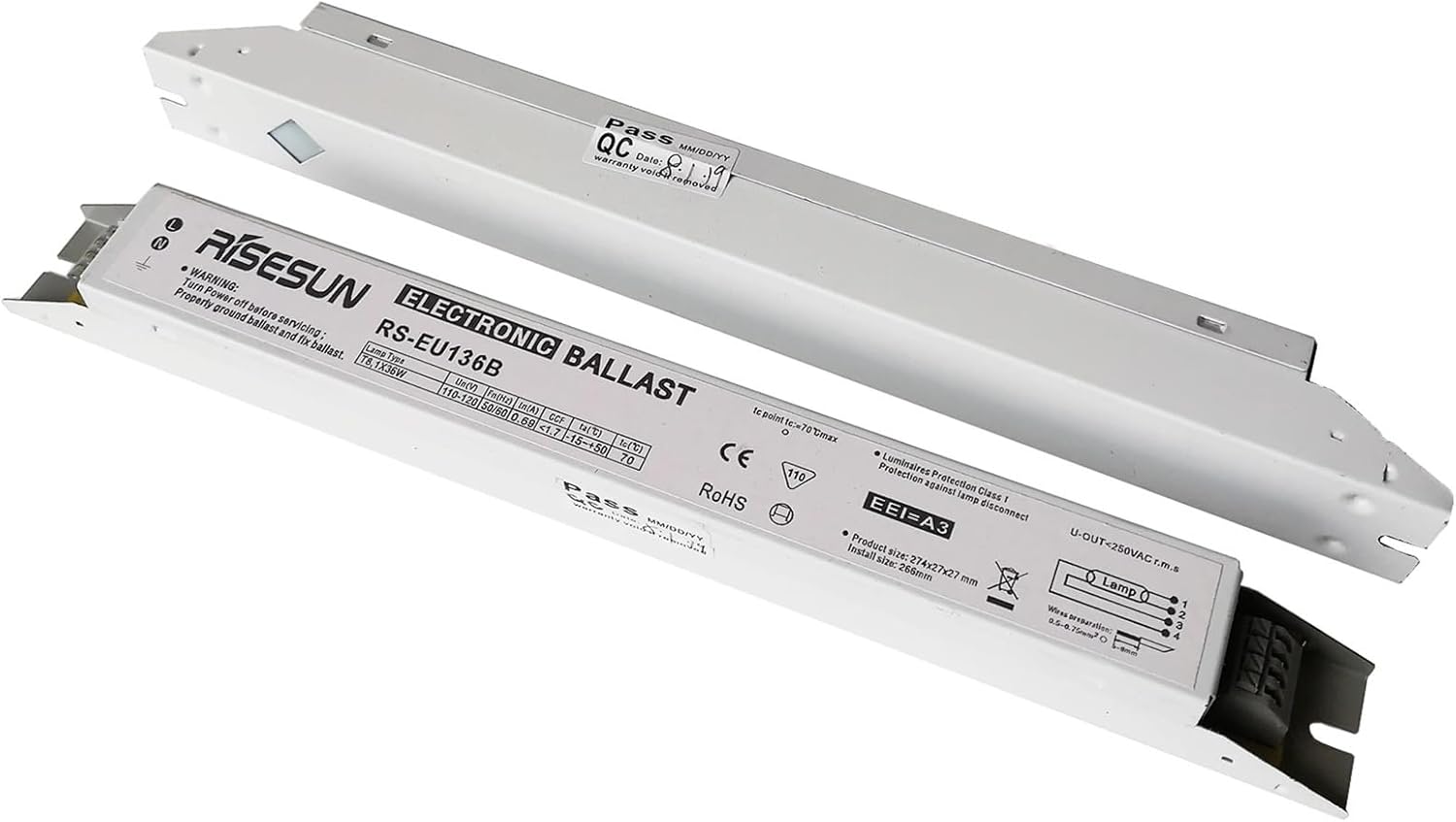 BallastsRS-EU136B 110V 36WX1 T8 VU Lamp Electronic Ballast Lighting Starter EEI=A31. Model number: RS-EU136B2. Protection Class: Luminaires protection class I, protection against lamp disconnect. EEI=A33. Lamp Type: T8, 1X36W4. Product size: 274x27x27mm, install size: 266mm5. Voltage: 110-120V, 50/60Hz, In: 0.69A6. Warning: turn power off before servicing. Properly ground ballast and fix ballast.7. Packing: 2 pieces 36W Electronic ballasts==========Model Number : RS-EU136BFeatures : EEI=A3Power Factor Compensation : ActiveBallast : electronicMatched Tube : T8Item Type : BALLASTS