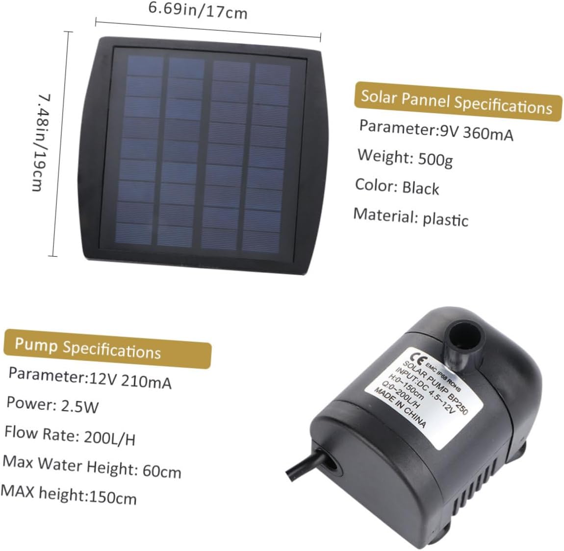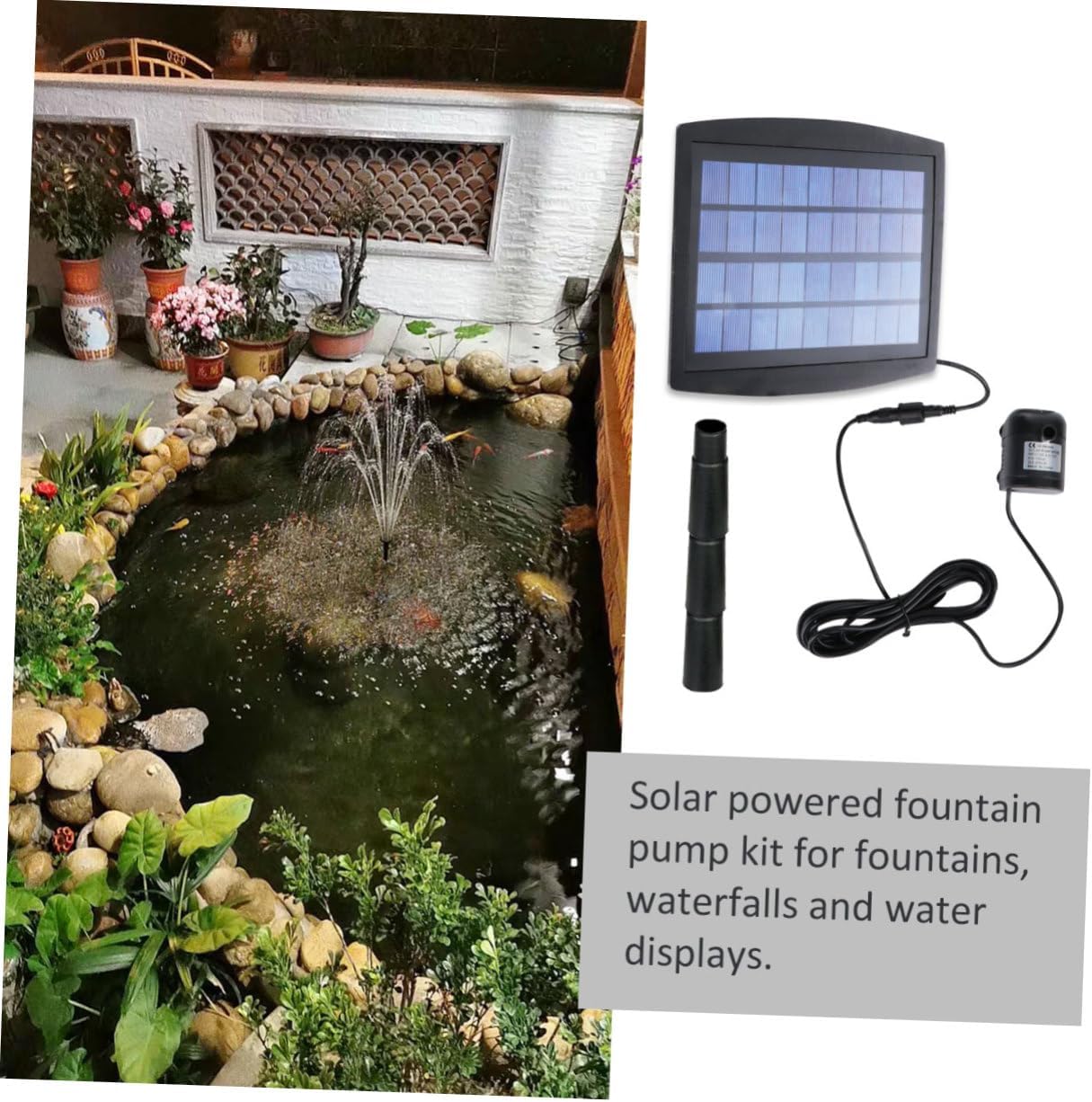 Package List 1 x Solar Fountain Pump Characteristics - Solar Pannel: 9V 360mA solar powered pond pump - Life: over hours solar pond fountain - Material: plastic solar fountain pump - Pump: 12V 210mA solar pond pump - Color: Black Note: This item cannot work without sunlight, it has not electric storage function. - Weight: 500g - Flow Rate: 200L/H - Power: 2.5W - Max Water Height: 60cm - Size: 20 x 18 x 3cm Specification solar powered fountain pump - Easy to install and you can move to different locations as you wish - Solar powered fountain pump kit for fountains, waterfalls and water displays. The height of water on strength of the sunlight. - Wide scope of spraying, the water flow is 200L/h with maximum height of 150cm - Great for pond, bird bath, fish tank, small pond, garden decoration, aquarium, fountains, spout and hydroponic systems and water circulation for oxygen, etc.Goods Descriptionsolar pond fountain Solar water operate anywhere that the sun shines, and the longer it shines, the more water they pump.solar pond pump The height of water on strength of the sunlight.solar powered fountain pump The of energy for an independent water supply.solar powered pond pump Solar powered fountain pump kit for fountains, waterfalls and water displays