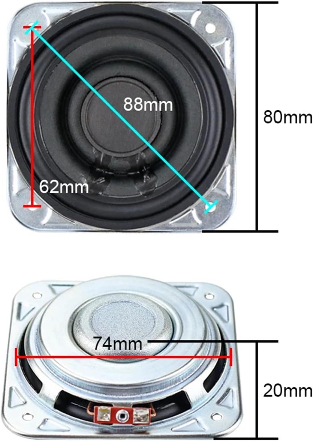 Speaker RepairSpecification3 inch 80MM For neodymium magnetic full frequency Midrange woofer Speaker,3OHM 20W style, big coil andlarge strokeSize: 3 inches 80MM ,Thickness 20MMImpedance power: 3 OHM, 20W,full RangeHole installation: 3 inch ,78MM Open holeInstallation pitch: 62 * 62MM ,Diagonal 88MM ,M3Net weight:94g/pcsPackage included:2pcs Speaker