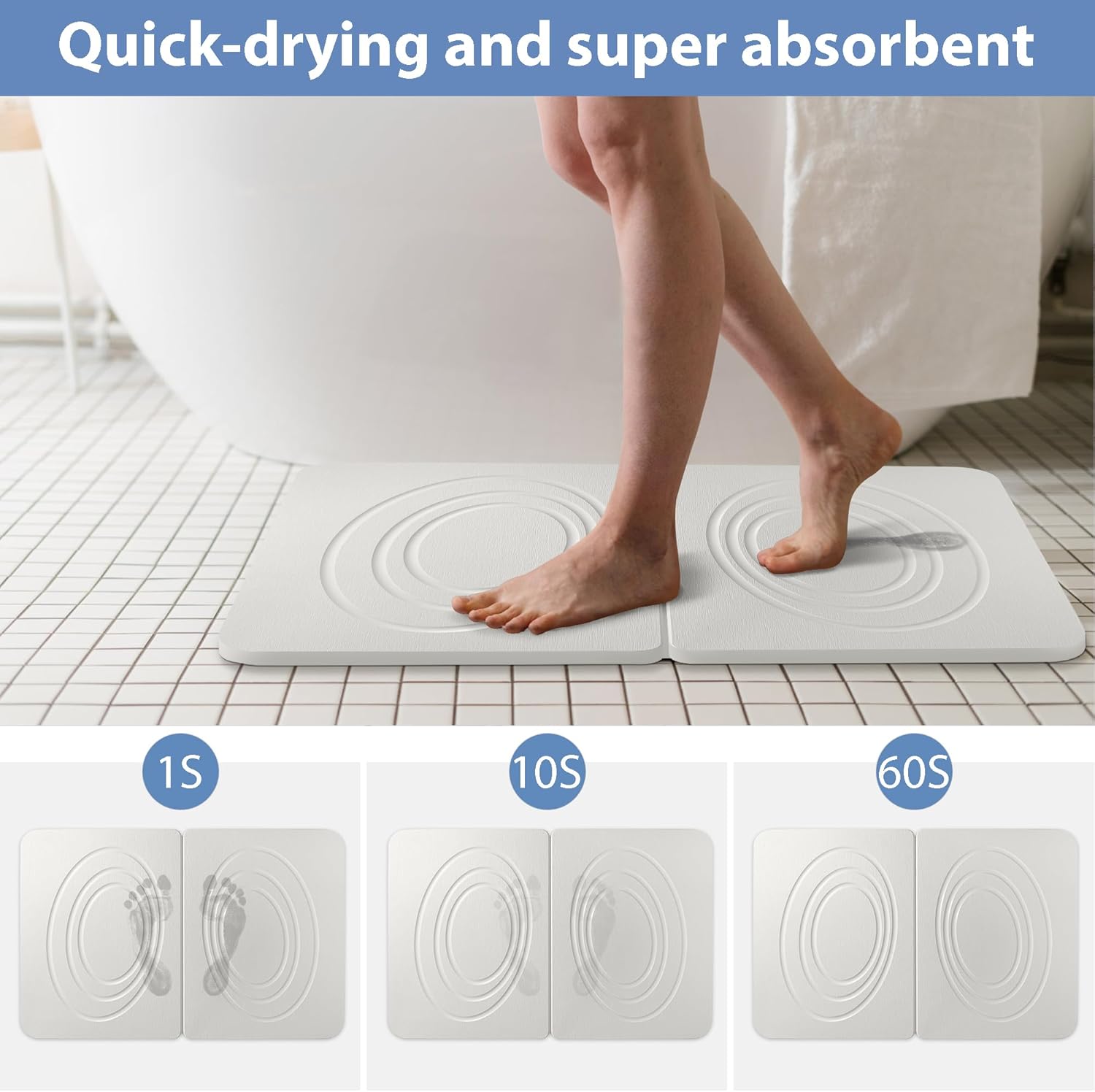 Step out of the shower onto instant dryness! Our premium Stone Bath Mat, crafted from natural diatomite and plant fiber, instantly absorbs water through its unique porous surface and micro-grooves. The wave-inspired grooves not only add an elegant texture but also maximize evaporation, ensuring your floor stays dry and slip-free. Effortlessly clean with just water or a quick wipe – no more soggy bath rugs! Its durable, non-slip design makes it perfect not just for your bathroom, but also as a kitchen counter drying mat, pet feeding area pad, laundry room helper, or even a bedside rug. Enjoy a cleaner, drier, and safer home with this versatile, eco-friendly essential. It includes a PVC anti-slip base and maintenance sandpaper for long-lasting performance.