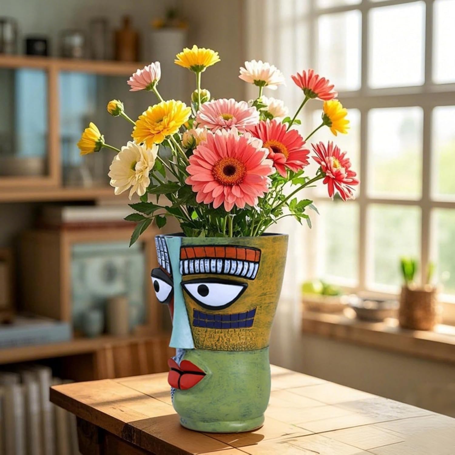 Product Description: Product size: 4.7*7.3 inches Product weight: 1.3 pounds Add a touch of modern artistry to your home with this abstract face planters pot. Designed for those who appreciate bold aesthetics, this abstract flower pot is more than just a planter—it’s a statement piece! With its vibrant, hand-painted finish and intricate abstract face design, it captures the essence of artistic expression while serving as a functional planter for your favorite indoor plants. Made from high-quality resin, this abstract face planter pot is lightweight, durable, and resistant to breakage, making it a perfect alternative to traditional painted face terracotta planters. Its built-in drainage hole ensures proper water flow, preventing root rot and keeping your plants in optimal condition. This planter is the perfect size to accommodate various small plants, making it a great choice for medium planter art. Whether placed on a shelf, desk, nightstand, or windowsill, it transforms any space with its playful yet sophisticated charm. Perfect as a conversation starter or a unique decor piece, this funny planter for indoor plants blends creativity with practicality. It’s also a great choice for collectors of head pots or abstract pots for plants, making it a must-have for those who appreciate handcrafted artistry. Bring home this Picasso pot today and let art and nature harmonize in your space!