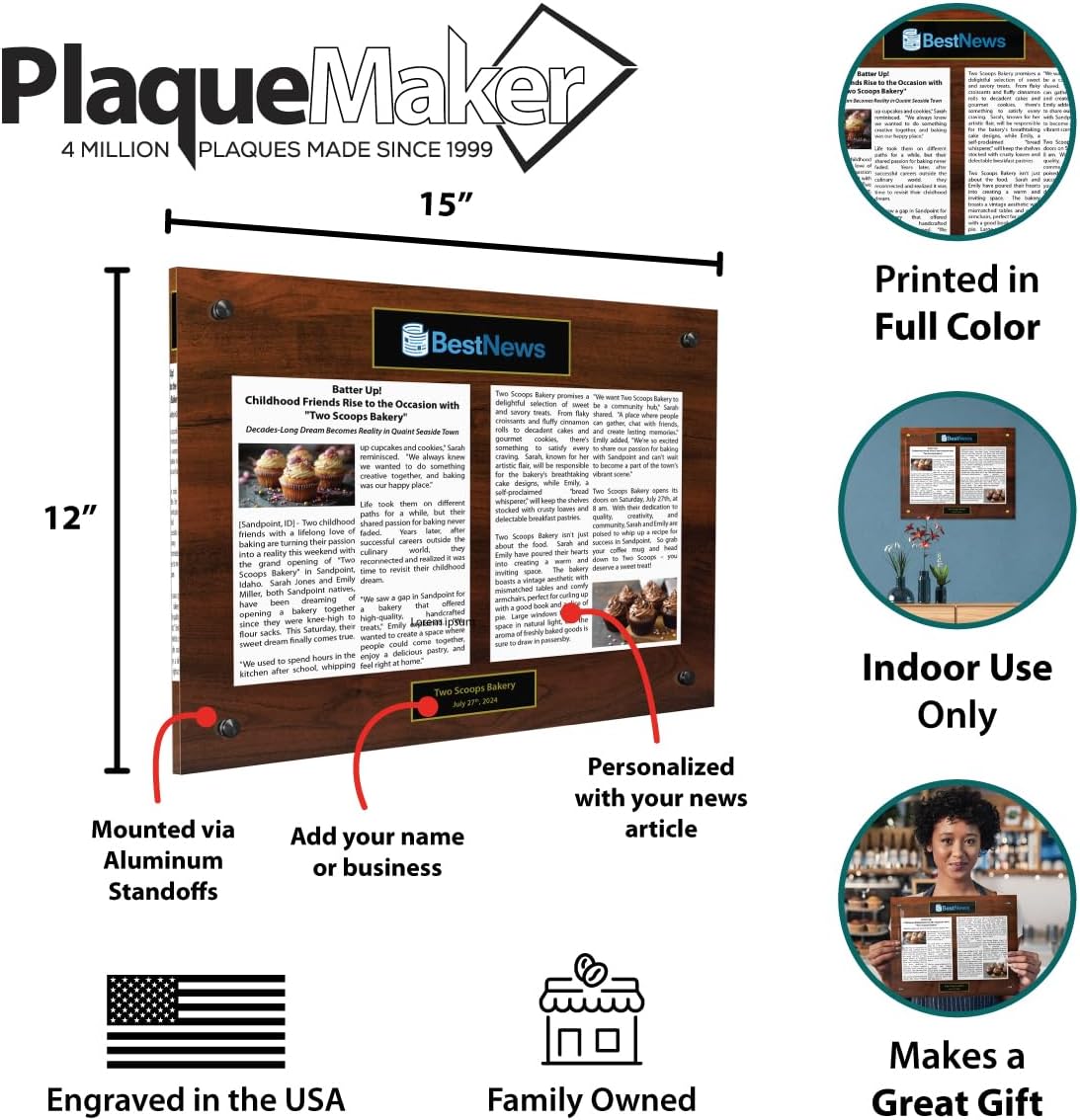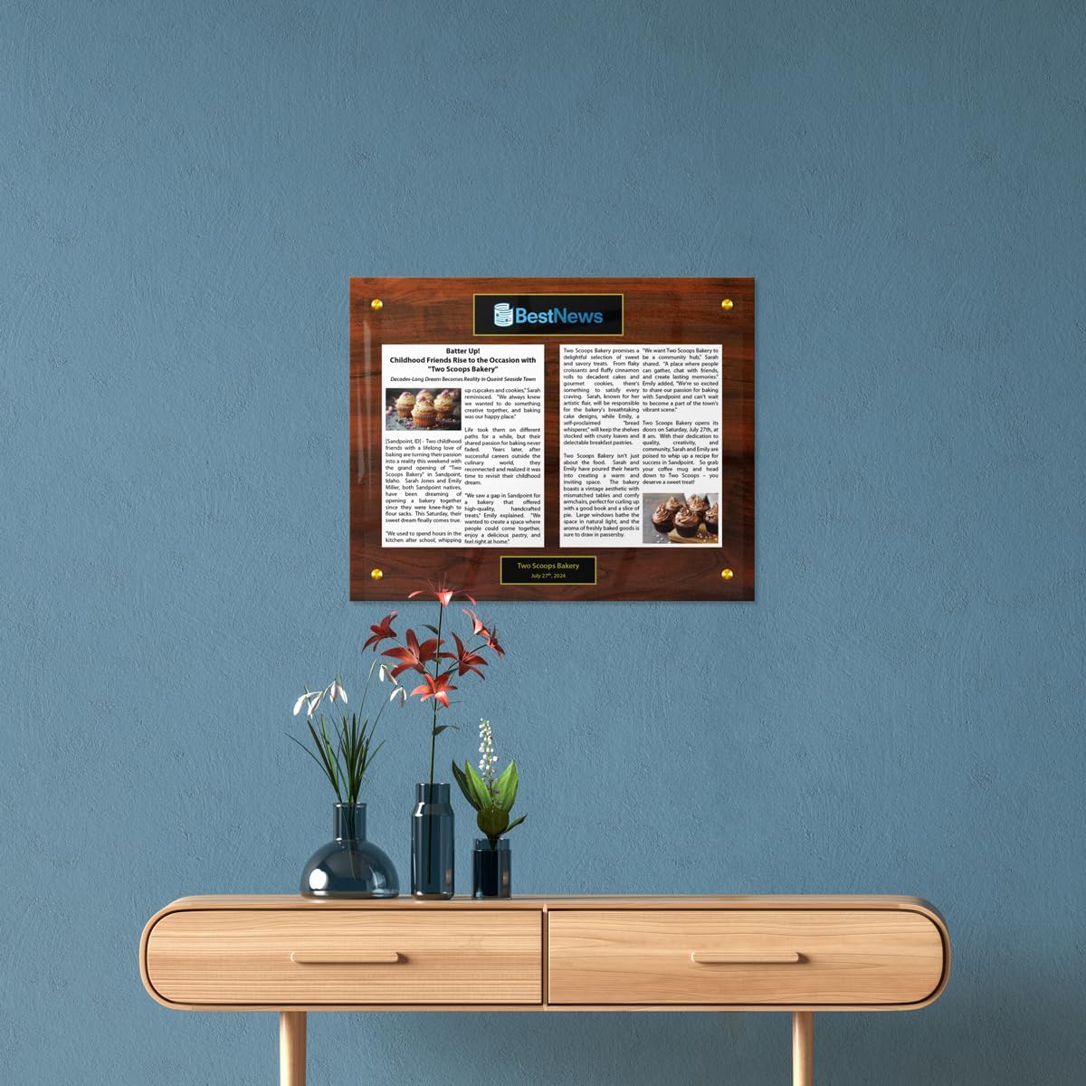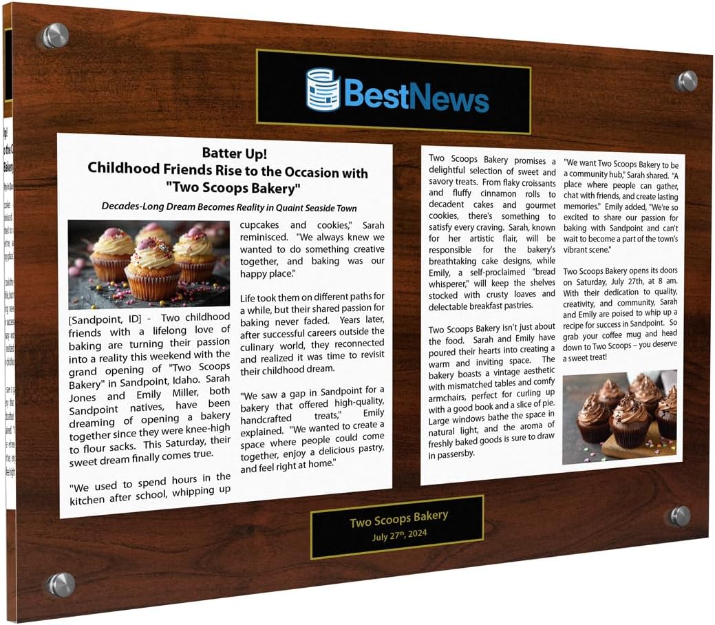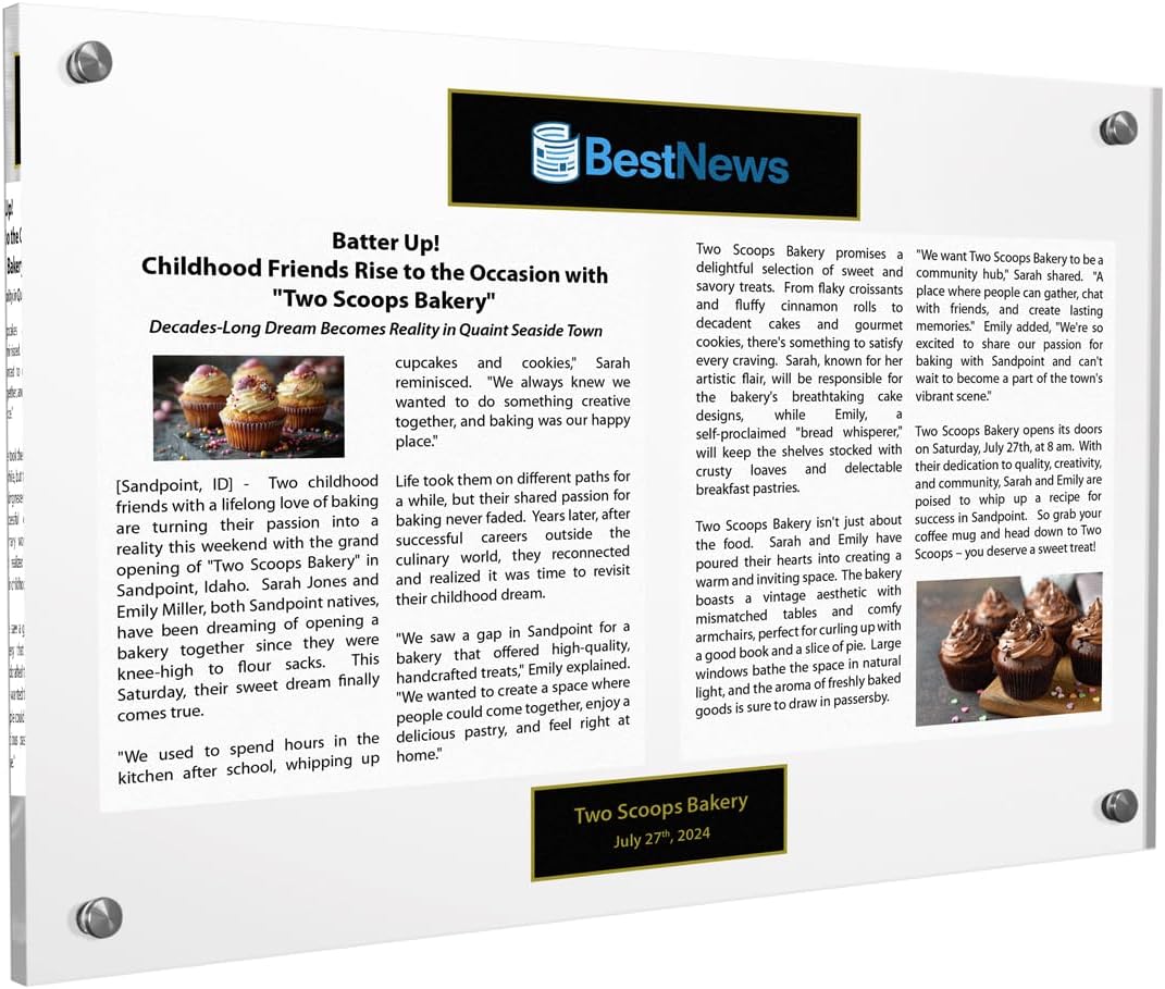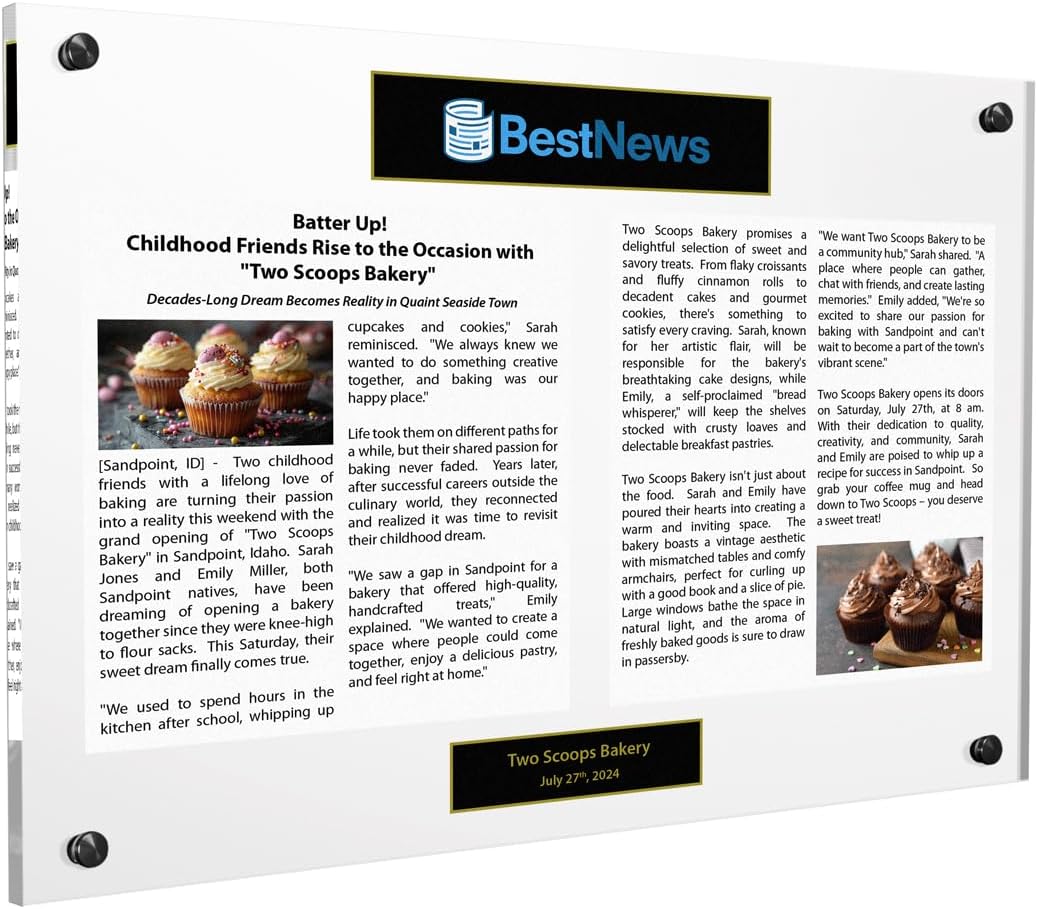 Preserve your cherished memories or milestones with this sleek and modern newspaper or magazine plaque. Crafted from high-quality acrylic, this display case allows you to showcase your favorite articles, company announcements, or personal achievements in a stylish manner. Available in various sizes ranging from 12 x 15" inches to larger options, and a selection of colors to complement your decor, this plaque offers versatility to suit your needs. This newspaper plaque provides a sophisticated way to commemorate your special moments. Easily customizable with your article, company information, or personal details, this plaque makes a thoughtful gift or a unique addition to your home or office. Preserve your treasured memories for years to come with this elegant and functional newspaper or magazine display.