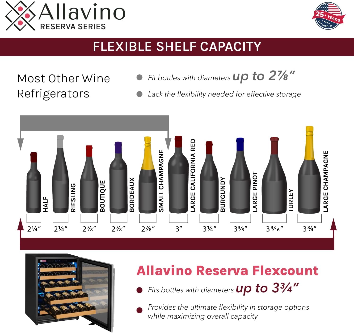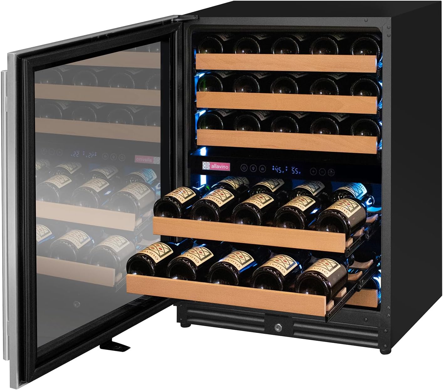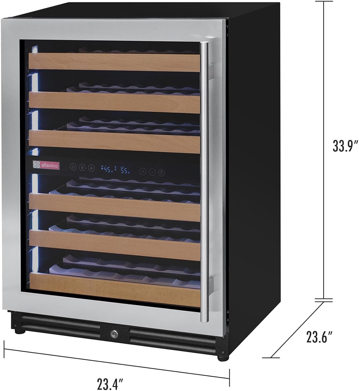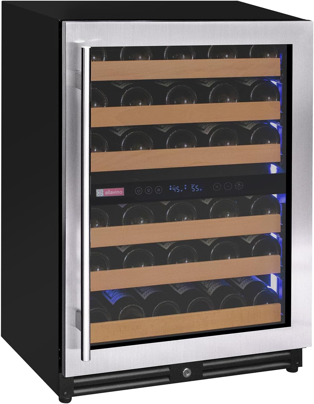 The Allavino Reserva Series VSW5134D-2SL Dual Zone Wine Refrigerator with Tru-Vino Temperature Control Technology makes it easy to store up to 56 wine bottles of various sizes. and can be used as a stylish freestanding unit or built into your cabinetry for seamless wine storage. Protect and preserve your wine collection with the latest innovation in wine storage technology by Allavino. Precisely set your desired temperature with the easy-to-use digital control panel and trust in Tru-Vino Temperature Control Technology to protect your collection through consistent temperature maintenance. Allavino's exclusive FlexCount wine racking technology cradles bottles and is designed with vibration-reduction technology to protect aging wines. This unique shelving design allows for ultimate flexibility and versatility when it comes to storing a variety of bottle sizes and shapes. Easy gliding shelves allow for easy access to your collection without disrupting the delicate wine maturation process.