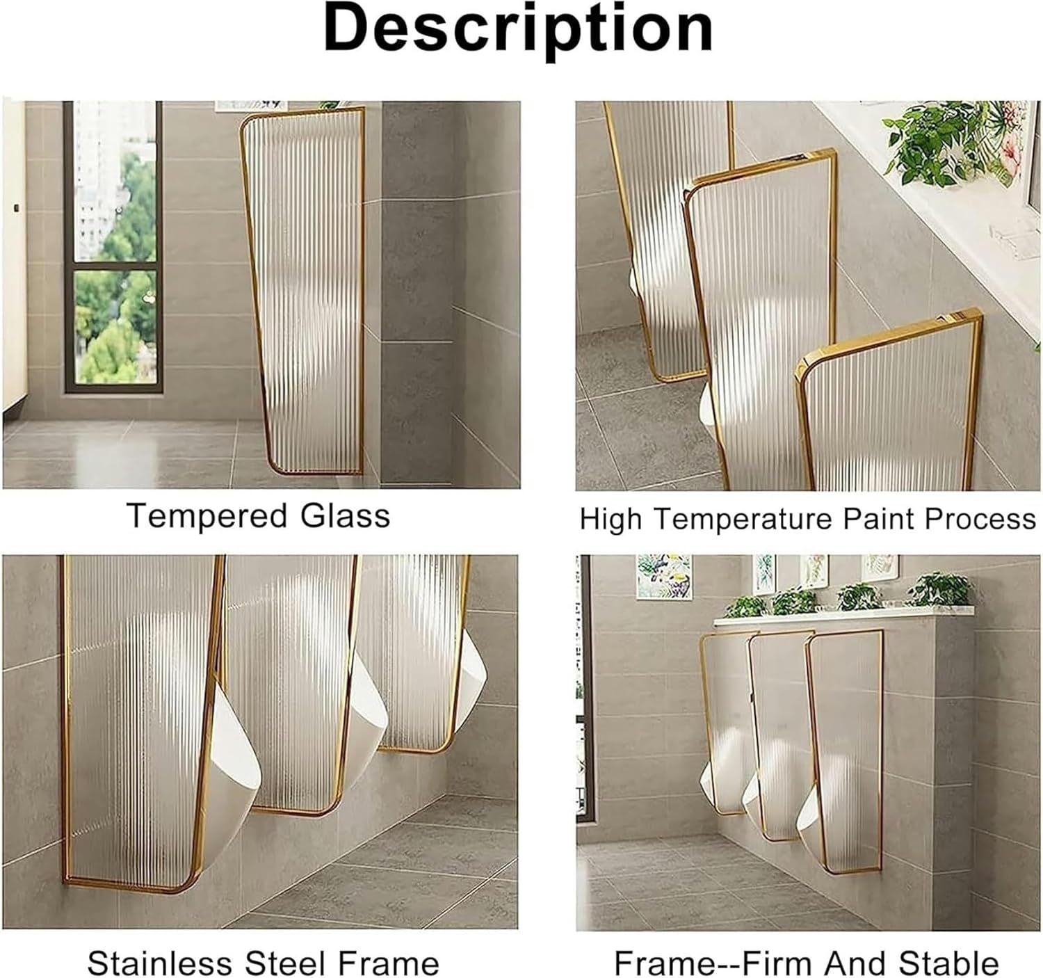 A room divider wall will provide extra privacy, block some visual clutter and make the space more clutter-free.The elegant design can also help you decorate your room while creating privacy, it is the best partition for public toilets.The screen mounts quickly and easily to any hard wall, is space-saving and easy to clean.The modern and minimalist bathroom partition achieves the privacy separation of space. It is not only a space divider decoration, but also protects your privacy. It is the best privacy partition for public toilets!The room divider is modern and simple, suitable for family bathrooms, bedrooms, hotels, bars, restaurants, schools and other public spaces.Specification:Product name: urinal partitionMaterials: stainless steel frame, tempered glassSize: height 120cm, width 40cmColor: Black , White , Gold , Rose GoldProject: Urinal partitionType: urinal screenInstallation type: wallIncluding: urinal partition × The number of pieces you purchased installation hardwarenote:Regarding the color: the product picture is taken in kind, but there may be a slight color difference due to different lighting screens, etc. Please understandAbout size: the size of the product is measured manually, there may be an error of about 1-2 cm, please understand