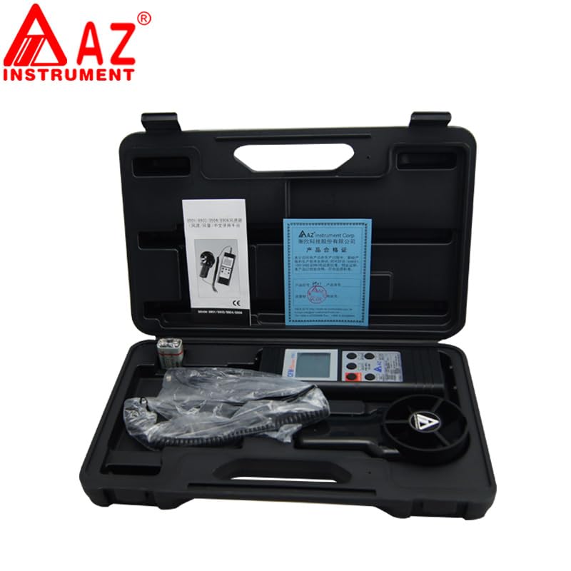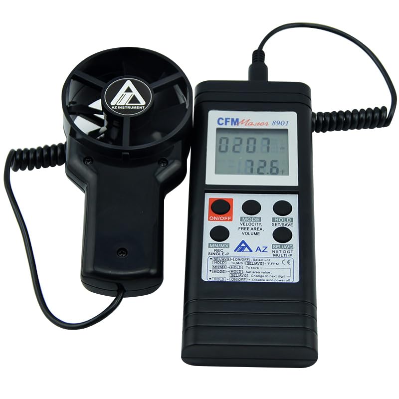 ApplicationApplication of 8901 AZ Handheld USB Output Anemometer:The 8901 AZ wind speed meter has the remote fan to measure the Temperature and Air Speed.The 8901 AZ Anemometer also could help user to check the air velocity FPM (Feet per minute) and Air Volume CFM (Cubic) in residential, light commercial and standard commercial systems.The 8901 AZ Air Flow Meter with Remote Fan is the best choice as the wind speed monitoring device in HVAC (Heating, Ventilation, Air Conditioning and Refrigerating) or industrial related application.Model:8901Wind Speed Range:0.4~35 m/s; 80~6900 ftmWind Speed Accuracy:±(2% of reading+0.2 m/s)Air Temperature Range:-10~50.0℃Air Temperature Resolution:0.1℃, 0.1℉Air Temperature Accuracy:±0.6℃Wind Speed Unit (Metric):m/s (meter per second)Wind Speed Unit (Imperial):ft/m (fee per minute)Air Volume Unit (Metric):cms (cubic meter per second)Air volume Unit (Imperial):cfm (cubic meter per minute)Temperature Response Time:60 seconds (typical)LCD Update:Every secondAir Volume Display:0~99999 m3/sAir Volume Resolution:0.1 (0~9999.9) or 1 (10000~99999)LCD Size:42(L) * 37(W) mmOperating Temperature:0~50℃Operating RH%:Humidity <80%Storage Temperature:-10~50℃Storage RH%:Humidity <90%PC Link:YES8 Pints Velocity Average:YESBattery Life:100 HoursMeter size: 180(L) * 73(W) * 38(H) mmVane size: 152(L) * 75(W) * 42(H) mmWeight:~170gBattery:9V Battery *1 PC or 9V DC AdaptorStandard Package:Meter, Vane Probe, Manual, Hard Carry Case
