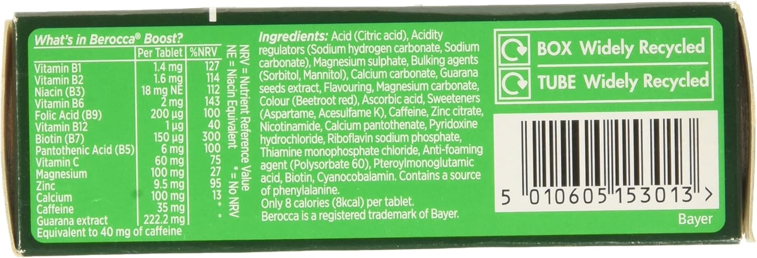 Berocca Boost is packed with vitamins and minerals. It also contains caffeine, plus guarana a herb native to the Amazon basin, which is a natural source of caffeine. Vitamins B1 and B2 help support natural energy release, B6 and B12 help reduce tiredness and fatigue, whilst caffeine helps to increase your alertness and concentation to give you a little kick to help keep you going. Do not exceed 400mg of caffeine per day. Not recommended during pregnancy or for those breast feeding.