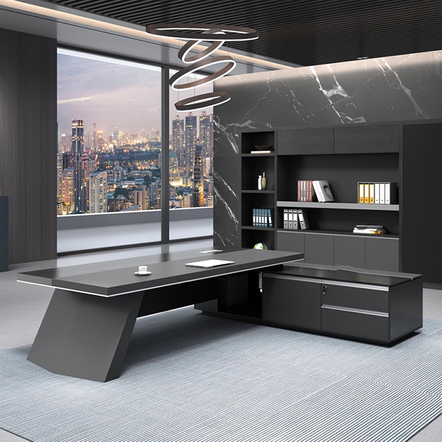 Specifications:Shape: L-shapedType: L-shaped deskMaterial: Wood, MetalDimensions: 94"L x 71" W x 29.5"H;Drawer: YesPower socket: YesSide cabinet direction: Left, RightApplicable places: Home, OfficeSide cabinet direction: L: Left; R: RightPackage includes:Desk x 1Installation accessories x 1