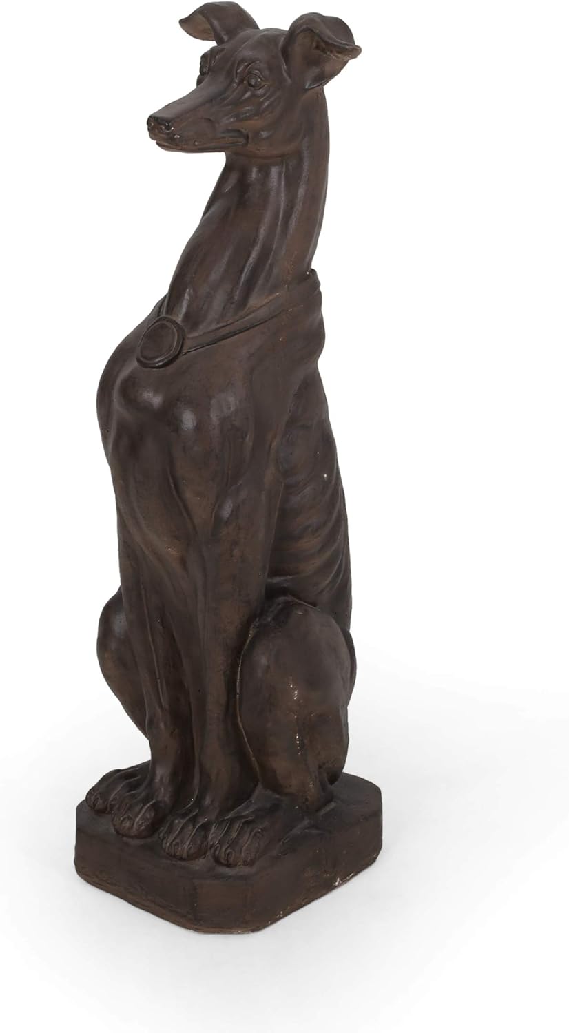 Offer your home a lovable depiction of man’s best friend to bring a regal charm to your outdoor space. Beautifully crafted from cast stone, our garden statue features an incredible greyhound design consisting of gorgeous details such as intricate facial features and a proud medal around its neck. This statue offers a durable structure and weather-resistant properties making this a perfect addition to your backyard or patio space. Finished with a neutral brown wash, this exquisite garden accessory will easily bring your decor to the next level. Includes: One (1) StatueMaterial: Cast StoneFinish: Dark BrownHand-Crafted DetailsNo Assembly RequiredDimensions: 10.75 inches deep x 9.50 inches wide x 33.00 inches high