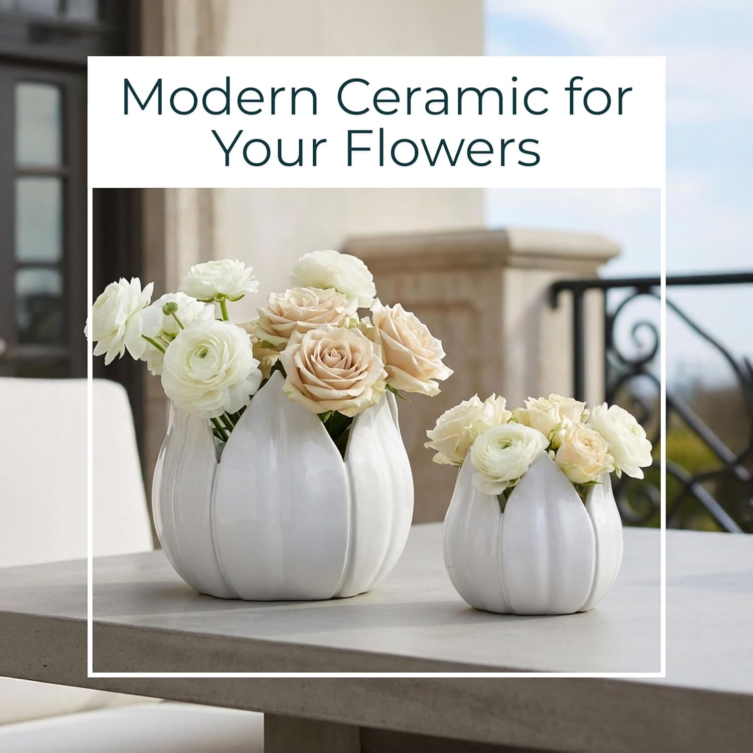Designed by Sagebrook Home, this set of two white ceramic planter pots turns everyday greenery into a clean, sculptural moment that still feels relaxed and livable. The petal-inspired silhouette adds gentle movement and height, giving your plants a defined base without competing with the foliage or the rest of your room. Use the 7" and 5" sizes together for a layered vignette or style them separately as indoor. When the weather is mild, bring them into covered outdoor spaces as part of your seasonal decor, creating a simple garden look that feels intentional rather than improvised. Each ceramic piece works as a standalone indoor pot or as a decorative sleeve for nursery containers, orchid vessels, or small garden pieces you already own, so you can upgrade the look without repotting. The soft white finish layers easily with cream accents, other white pieces, and collected ceramic objects, helping these planters slip into existing arrangements with minimal effort. Whether you think of it as a planter, a planter pot, or an indoor ceramic accent, this set keeps your plant styling streamlined, flexible, and visually calm across rooms and seasons.