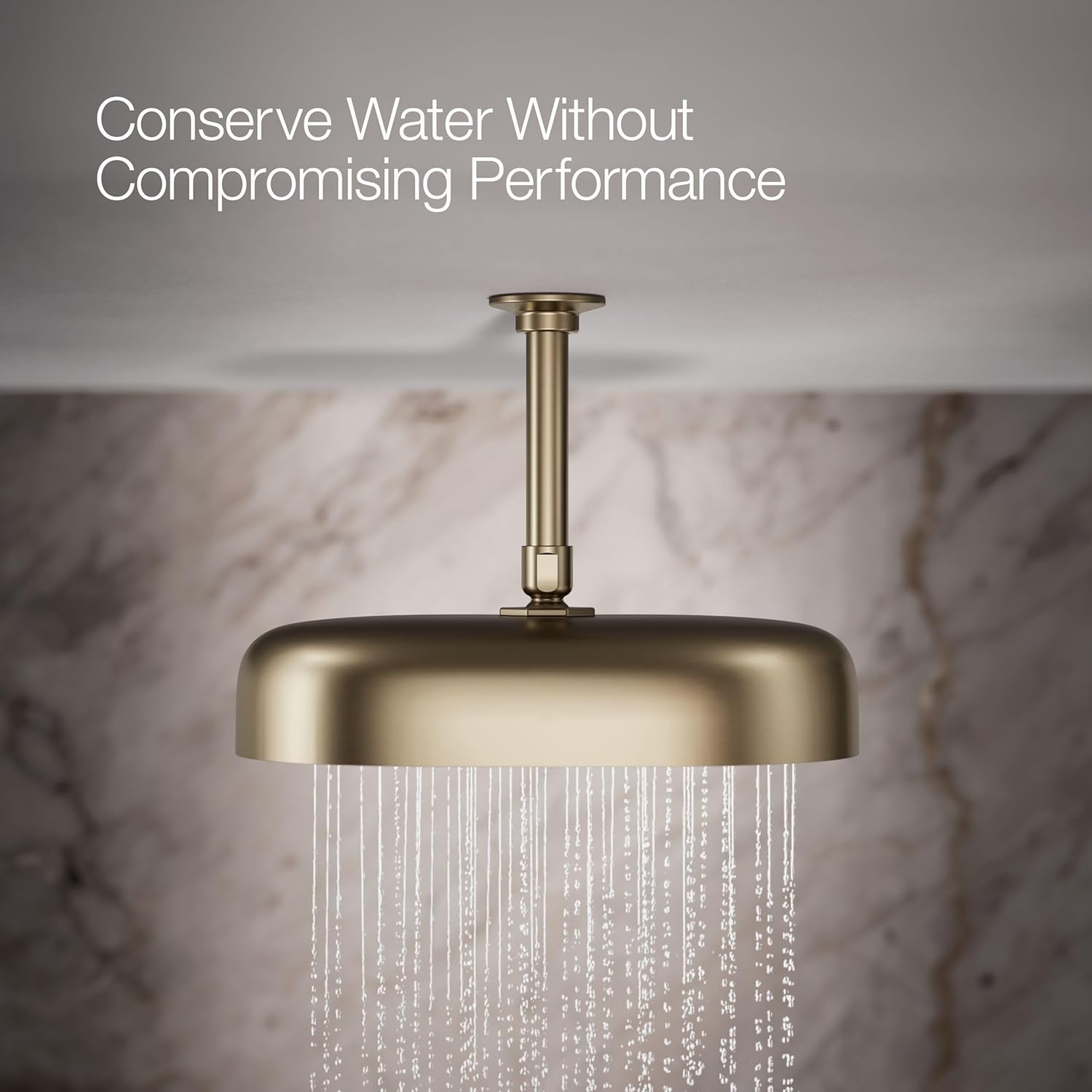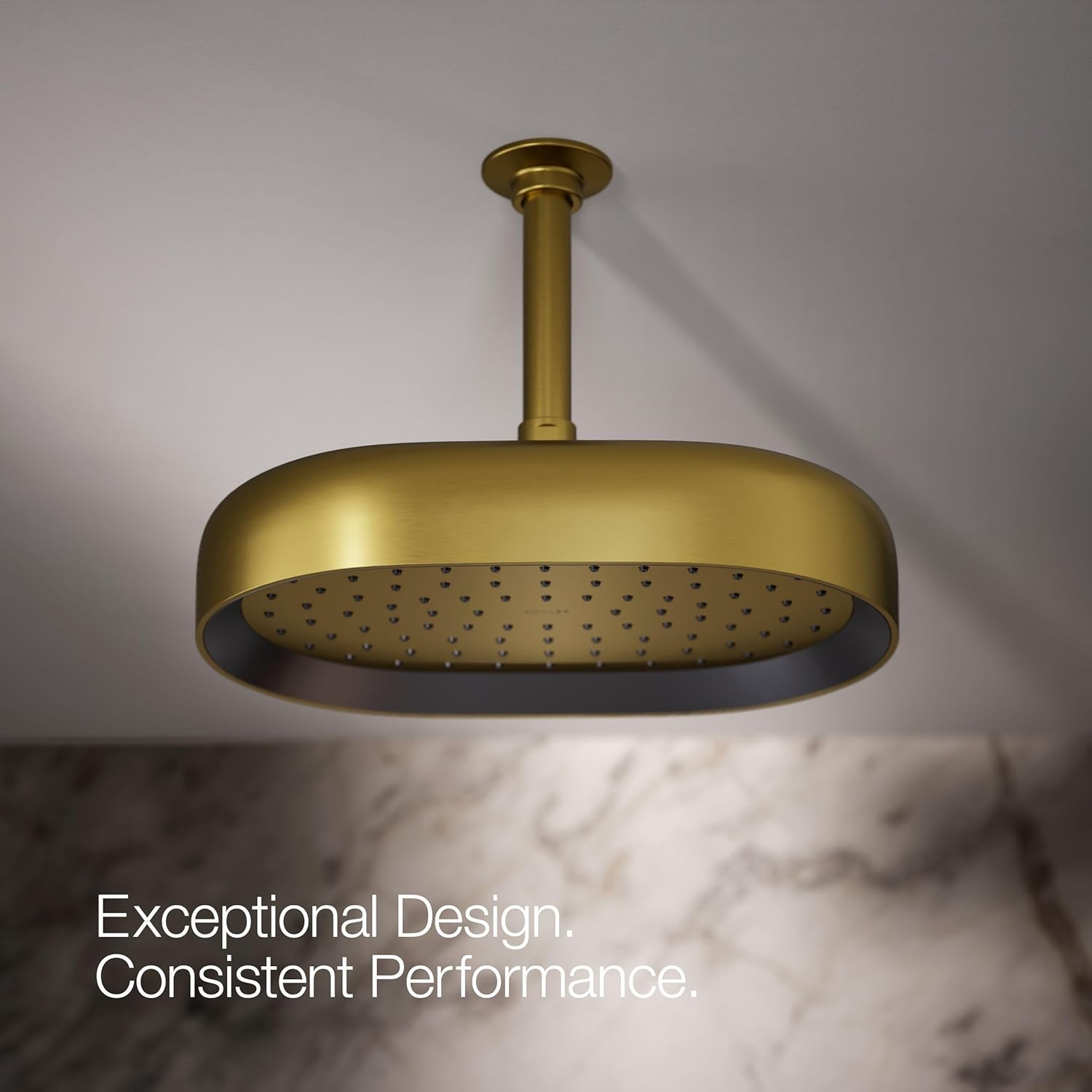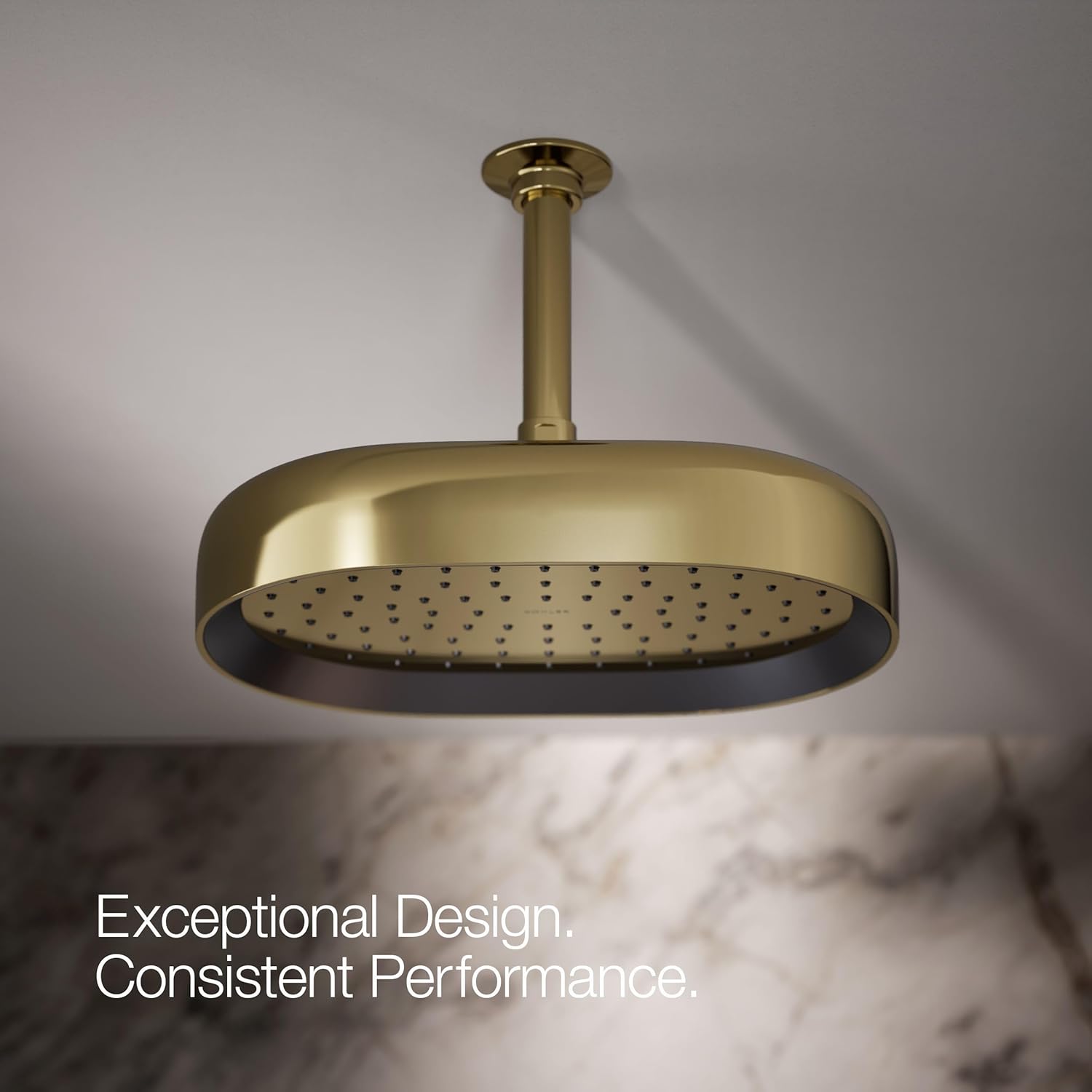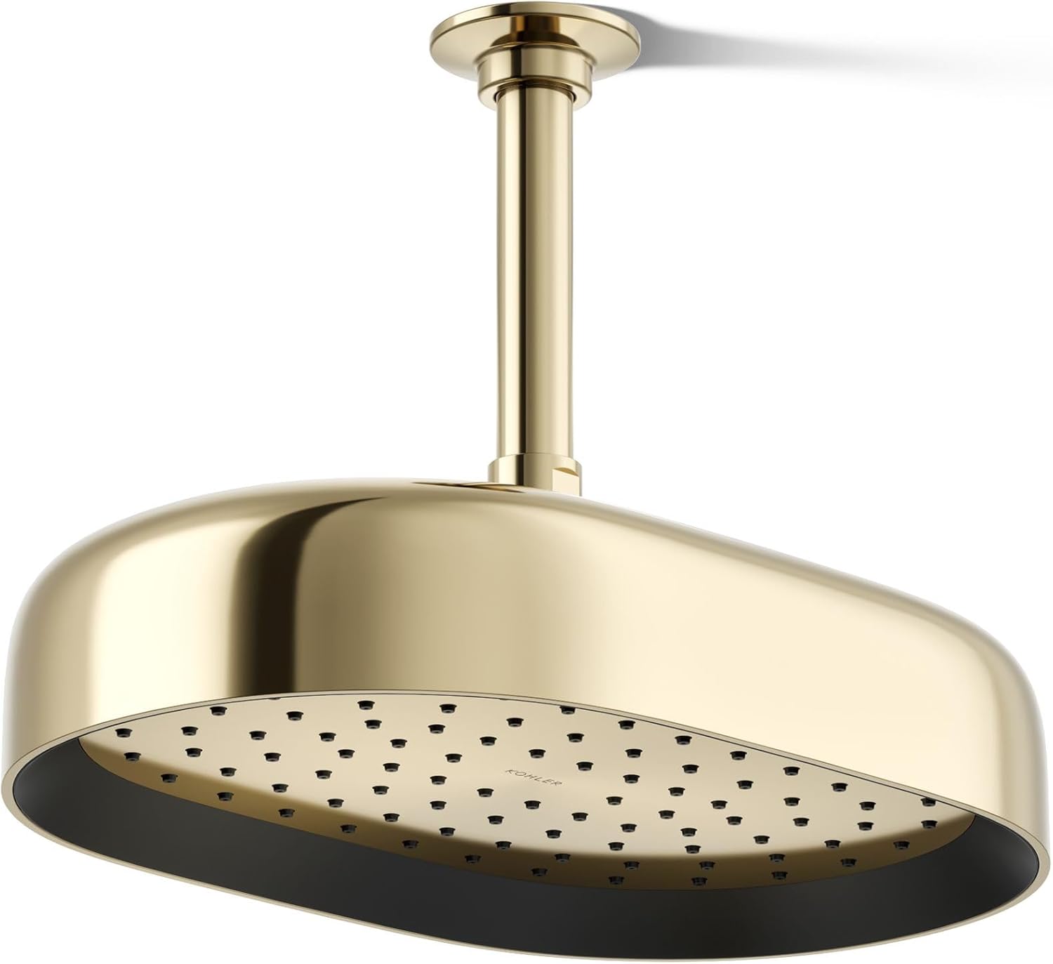 Enjoy a shower that simulates a soaking summer storm, all while conserving water. This KOHLER Statement contemporary 12" oblong ceiling-mount rainhead features Full Coverage with Katalyst air-induction technology, which efficiently mixes air and water to produce large water droplets and deliver a powerful, consistent, full overhead spray experience at 1.75 gpm. The single-function rainhead's clean design and durable finish coordinate with many KOHLER faucets and accessories.