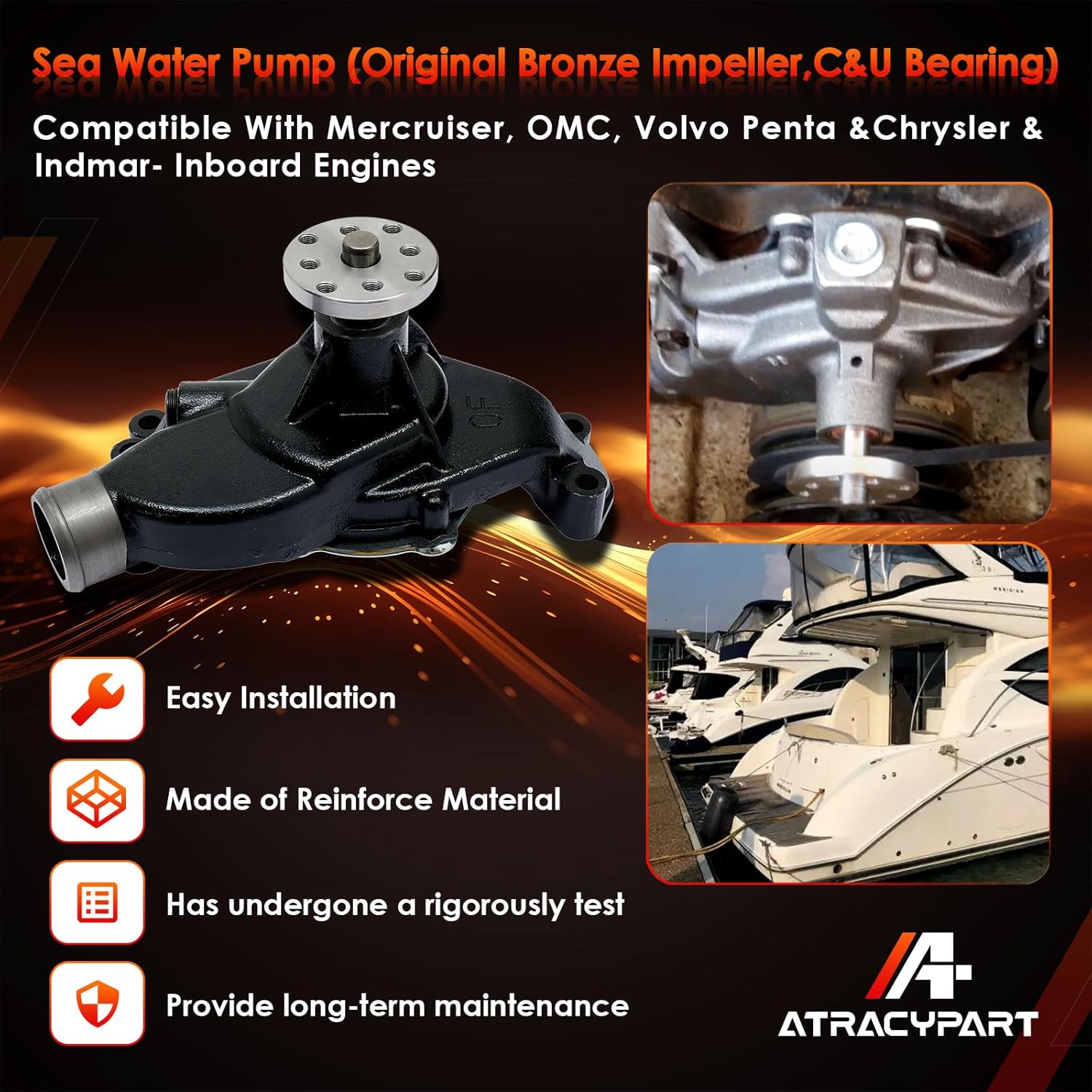 Compatible With:4.3L, 5.0L, 5.7L V6/V8 Engines, including Penta, mercruiser, OMC, Stern Drive, Indmar, ChryslerPleasurecraft Small Block Cooling Systems 140-200 Hp I V6, 155-205 Hp | V8, 230-2601963-2014 Mercruiser1973 & later Penta1968-1998 OMC1981-1984 Inboard Engine 2601995-1998 Inboard Engine 350 MAG2012 Inboard Engine 350 MAG1995-1997 Inboard Engine 350TBI 1996 Inboard Engine 350MPI1988 Inboard Engine 5.0L1988-1998 Inboard Engine 5.7L 2014 Inboard Engine 5.7L1998 Inboard Engine 6.2L2007-2013 Miscellaneous1997-1998 Race Stern Drive1981-1989 Race Stern Drive2000-2004 Race Stern Drive 377**AND MORE ATTENTION: This pump can NOT replace the engine water circulating pump used on 2007 and newer V6 4.3L engines without water bypass holeReplaces OE#:Mercruiser 8M0113734, 46-8M0113734, 17437, 60658, 811841, 850399, 8503991, 850399002, 850399R04, 878341, FI1101208, FI1100742, FI1101292OMC Stern Drive 985429, 980477, 382218, 3853850, 383953 Penta 3853850, 856364, 835390Pleasurecraft (PCM) RA057018Sierra 18-3599, 18-3583, 18-3506, 18-3599-2MALLORY 9-42606 MES WP453MGLM 15200, 15201Crusader 7142520, 20318Indmar 551045, 55-1045Warranty:36-MonthAt ATRACYPART, we take pride in the quality of our products and in your satisfaction. If you have any problems, do not hesitate to contact us.