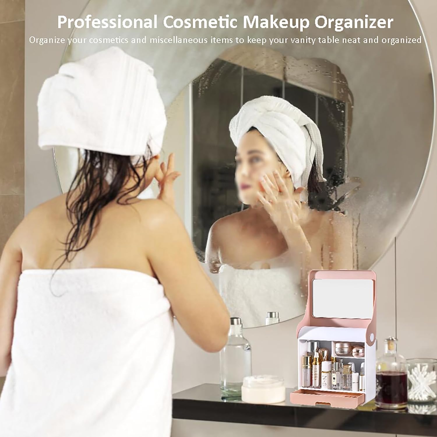 Headache about costemtics makeups mess up?You have lots of lotions, facial creams, essential iols, perfumes, lipsticks, facial masks and power brush in your bathroom. The table is mess up and these items are always wet and dirty. You waste much time to find your items and clean them. Most of the organizers in the market are too small and cannot hold all your items. Or they are open top, so the items are moisture and dusty. We design the upgrade acylic cosmetic organizer to solve all these problem, save you time, save the space.Organize all your collections in a stylish and professional way, Dust & waterproof Free.It is a best gift for your wife, mother, friends on Birthday, Mother’s Day, Christmas, Valentine’s Day, New Year, Anniversary and any other holiday.Specification:Color:pink,green,orangeMaterial: ABSSize:30x10.5x32cm(12x4x13inch)Package Including1 x Makeup Organizer With Mirror